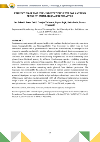 Zahović Ida; Dodić Jelena; Vučurović Damjan; Bajić Bojana; Dodić Siniša; Trivunović Zorana: Utilization of biodiesel industry effluent for xanthan production in lab-scale bioreactor : [abstract].
