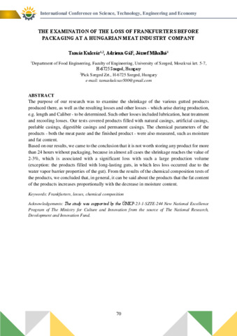 Kulcsár Tamás; Gál Adrienn; Mihalkó József: The examination of the loss of Frankfurters before packaging at a Hungarian meat industry company : [abstract].