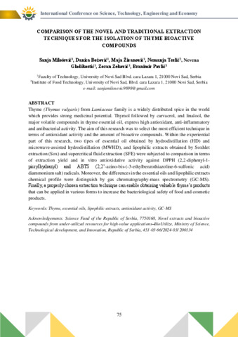 Milošević Sanja and Božović Danica and Živanović Maja and Teslić Nemanja and Gladikostić Nevena and Zeković Zoran and Pavlić Branimir: Comparison of the novel and traditional extraction techniques for the isolation of thyme bioactive compounds : [abstract].