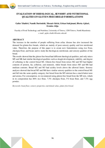 Xhabiri Gafur; Durimishi Namik; Idrizi Xhezair; Sulejmani Erhan; Ajdari Blerta; Alija Ermira: Evaluation of rheological, sensory and nutritional qualities in gluten-free bread formulations : [abstract].