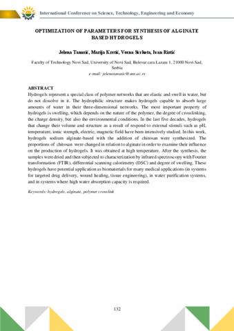 Tanasić Jelena; Krstić Marija; Svrkota Vesna; Ristić Ivan: Optimization of parameters for synthesis of alginate based hydrogels : [abstract].