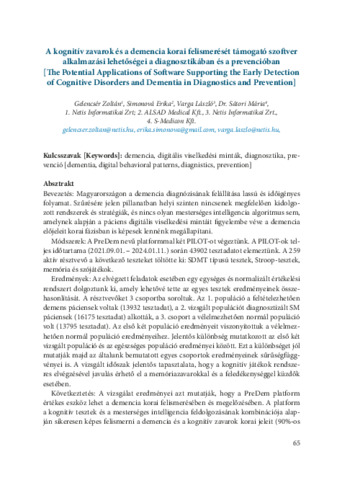 Gelencsér Zoltán; Simonová Erika; Varga László; Sátori Mária: A kognitív zavarok és a demencia korai felismerését támogató szoftver alkalmazási lehetőségei a diagnosztikában és a prevencióban = The potential applications of software supporting the early detection of cognitive disorders and dementia in diagnostics and prevention : [absztrakt].