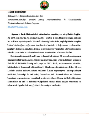 Dávid Benjámin: Gyoma és Endrőd társadalmi változásai az anyakönyves vizsgálatok alapján : [absztrakt].