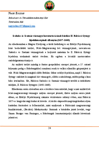 Nagy Zoltán: Szabolcs és Szatmár vármegye hovatartozásának kérdése II. Rákóczi György fejedelemségének alkonyán : 1657-1660 : [absztrakt].