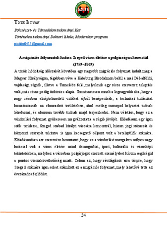 Tóth István: A migrációs folyamatok hatása Szeged város életére a polgárságon keresztül : 1759-1869 : [absztrakt].