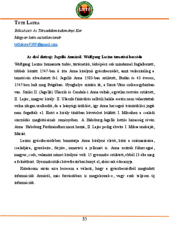 Tóth Laura: Az első életrajz Jagelló Annáról: Wolfgang Lazius temetési beszéde : [absztrakt].