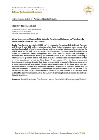 Pegoraro Soares Fabiana: Water resources and sustainability in the La Plata basin: challenges for transboundary environmental education and training : [abstract].