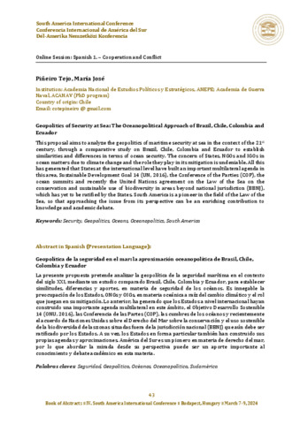 Piñeiro Tejo María José: Geopolitics of security at sea: the oceanopolitical approach of Brazil, Chile, Colombia and Ecuador = Geopolítica de la seguridad en el mar: la aproximación oceanopolítica de Brasil, Chile, Colombia y Ecuador : [abstract].