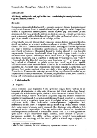 Kozsán Balázs: A közösségi médiaplatformok jogi korlátozása - társadalmi nyilvánosság intézménye vagy tech-óriások játéktere? In: Comparative Law Working Papers, (8) 2. (2024)