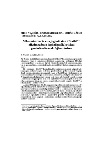 Mike Nimród; Karsai Krisztina; Orbán Gábor; Bubelényi Alexandra: MI-asszisztencia és a jogi oktatás: ChatGPT alkalmazása a joghallgatók kritikai gondolkodásának fejlesztésében. In: Acta Universitatis Szegediensis : forum : acta juridica et politica, (14) 1. pp. 157-190. (2024)