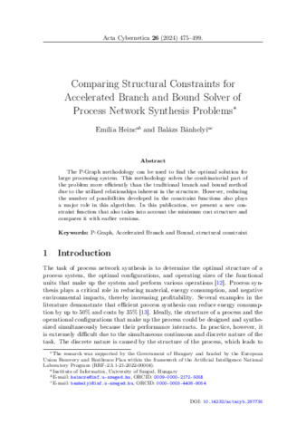 Heinc Emília; Bánhelyi Balázs: Comparing structural constraints for Accelerated Branch and Bound solver of process network synthesis problems. In: Acta cybernetica, (26) 3. pp. 475-499. (2024)