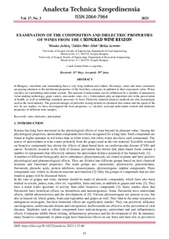 Juhász Blanka; Jákói Zoltán Péter; Lemmer Balázs: Examination of the composition and dielectric properties of wines from the Csongrád wine region. In: Analecta technica Szegedinensia, (17) 3. pp. 33-40. (2023)