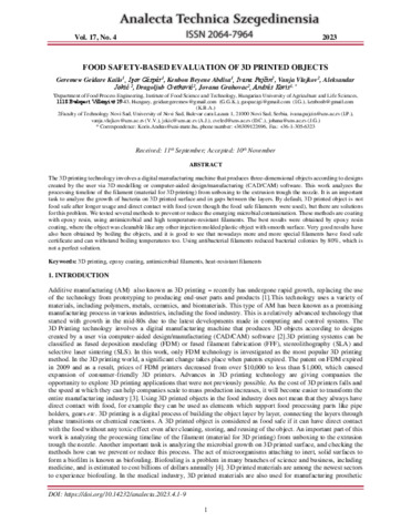 Kailo Geremew Geidare; Gáspár Igor; Abdisa Kenbon Beyene; Pajčin Ivana; Vlajkov Vanja; Jokić Aleksandar; Cvetković Dragoljub; Grahovac Jovana; Kőris András: Food safety-based evaluation of 3D printed objects. In: Analecta technica Szegedinensia, (17) 4. pp. 1-9. (2023)