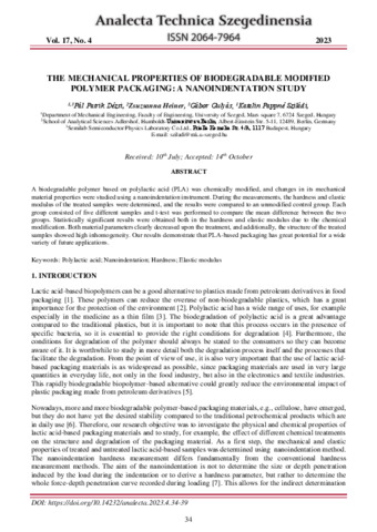 Dézsi Pál Patrik; Heiner Zsuzsanna; Gulyás Gábor; Pappné Sziládi Katalin: The mechanical properties of biodegradable modified polymer packaging. In: Analecta technica Szegedinensia, (17) 4. pp. 34-39. (2023)