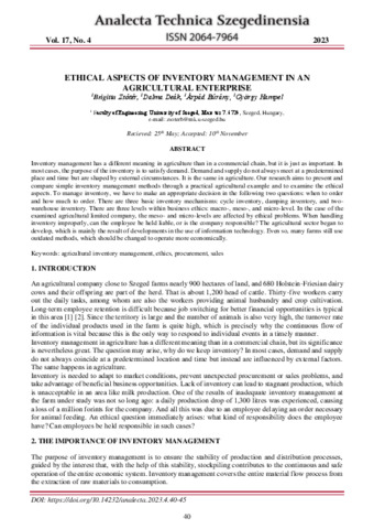 Zsótér Brigitta; Deák Dalma; Búrány Árpád; Hampel György: Ethical aspects of inventory management in an agricultural enterprise. In: Analecta technica Szegedinensia, (17) 4. pp. 40-45. (2023)