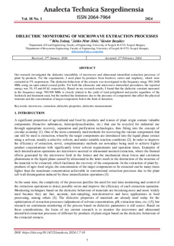 Dobozi Réka; Jákói Zoltán; Beszédes Sándor: Dielectric monitoring of microwave extraction processes. In: Analecta technica Szegedinensia, (18) 1. pp. 7-10. (2024)