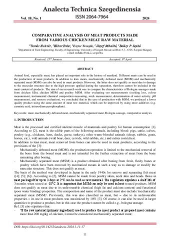 Kulcsár Tamás; Erdei Bálint; Trenyik Eszter; Mihalkó József; Szabó Balázs P.: Comparative analysis of meat products made from various chicken meat raw material. In: Analecta technica Szegedinensia, (18) 1. pp. 11-17. (2024)