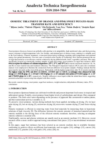 Lončar Biljana; Filipović Vladimir; Šovljanski Olja; Pezo Lato; Knežević Violeta; Šuput Danijela; Aćimović Milica: Osmotic treatment of orange and pink sweet potato-mass transfer rate and efficiency. In: Analecta technica Szegedinensia, (18) 3. pp. 59-68. (2024)
