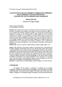Este estudio tiene el objetivo de presentar la evolución de los tiempos compuestos verbales en el español y en el portugués con la ayuda de textos procedentes de los siglos 15 y 16. La evolución de los tiempos compuestos verbales no es un tema desconocido entre los lingüistas, sin embargo, en este trabajo prevalece el análisis paralelo de un texto medieval conservado en el español y en el portugués, lo que hace posible estudiar el estado de la evolución de los tiempos compuestos en el mismo contexto y en la misma estructura en el período examinado. El método utilizado también permite comparar los diferentes parámetros en las lenguas estudiadas. En el presente estudio analizamos los diferentes rasgos de la gramaticalización de la construcción de los tiempos compuestos, como la selección del auxiliar, la concordancia del participio, el orden del auxiliar y el participio y la interpolación de elementos. This study aims to present the evolution of compound tenses in the Spanish and Portuguese languages with the help of texts from the 15th and 16th centuries. The evolution of compound tenses is not an unknown topic among linguists. However, in this work the parallel analysis of medieval texts preserved in Spanish and Portuguese prevails, which makes it possible to study the state of the evolution of compound tenses in the same context and in the same structure in the period examined. The method I used also makes it possible to compare the different parameters in the studied languages. In the present study we analyze the different characteristics of the grammaticalization of the construction of compound tenses, such as the selection of the auxiliary, the agreement of the participle, the order of the auxiliary and the participle, and the interpolation of the elements.