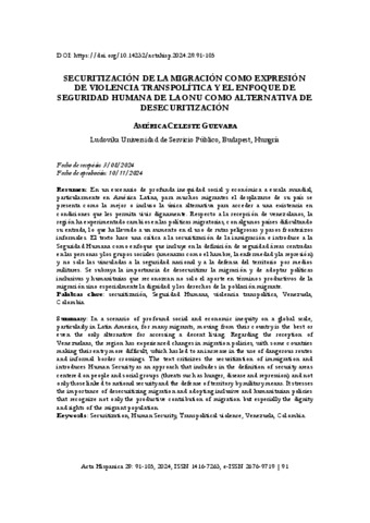 Guevara Parra América Celeste: Securitización de la migración como expresión de violencia transpolítica y el enfoque de Seguridad Humana de la ONU como alternativa de Desecuritización. In: Acta hispanica, (29). pp. 91-105. (2024)