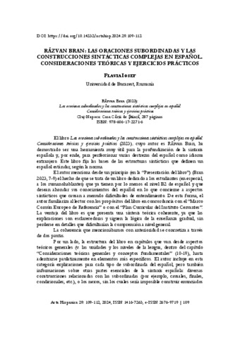 Iosef Indra-Flavia-Elena: Răzvan Bran: Las oraciones subordinadas y las construcciones sintácticas complejas en español : consideraciones teóricas y ejercicios prácticos. In: Acta hispanica, (29). pp. 109-112. (2024)