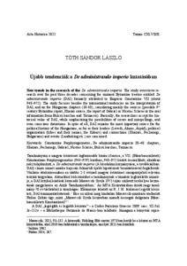The study overviews research over the past three decades concerning the eminent Byzantine treatise entitled De administrando imperio (DAI) formerly attributed to Emperor Constantine VII (about 948‒952). The study focuses besides the international tendencies on the interpretation of DAI, and on the Hungarian chapters (38-40), considering mainly the sources (possible 9th century Byzantine report, Khazar source, the report of Gabriel or Nicetas Scleros or the oral information from Bulcsú karchas and Termacsu). Basically, the researchers accept the historical value of DAI, while emphasizing the possibilities of errors and misspellings, and even conscious distortions. In spite of all, DAI remains the most important source for the political history of the Hungarians, as far as their leaders (Levedi, Álmos, Árpád), political organization (tribes and their names, the Kabars) and connections (Khazars, Pechenegs, Bulgarians) and events (Landtaking etc.) are concerned.