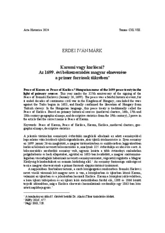 Erdei Iván Márk: Karomi vagy karlócai? : az 1699. évi békeszerződés magyar elnevezése a primer források tükrében. In: Acta Universitatis Szegediensis : acta historica, (148). pp. 17-35. (2024)