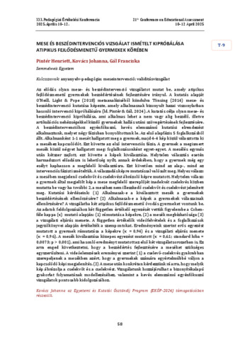 Pintér Henriett; Kovács Johanna; Gál Franciska: Mese és beszédintervenciós vizsgálat ismételt kipróbálása atipikus fejlődésmenetű gyermekek körében : [absztrakt].