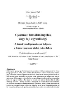 Lőwi Ildikó; Horváth Csaba Sándor: Gyarmati kizsákmányolás vagy faji egyenlőség? : a kubai vendégmunkások helyzete a Kádár-korszak utolsó évtizedében = Postcolonialism or racial equality? : the situation of Cuban guest workers in the last decade of the Kádár period. In: Belvedere Meridionale, (36) 4. pp. 11-32. (2024)