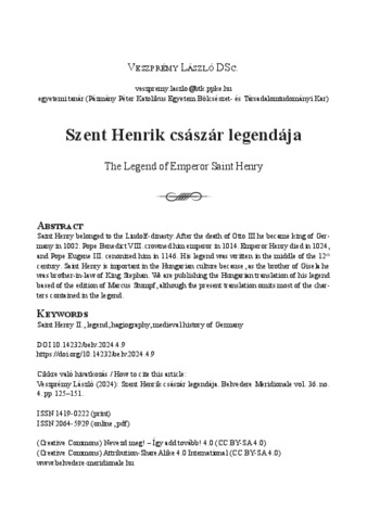 Veszprémy László: Szent Henrik császár legendája = The legend of emperor Saint Henry. In: Belvedere Meridionale, (36) 4. pp. 125-151. (2024)