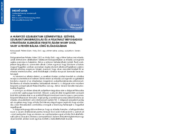 Dezső Luca: A hiányzó szubjektum színrevitele: szöveg, szubjektumábrázolás és a felkínált befogadási stratégiák elemzése Fekete Ádám Moby Dick, vagy a fehér bálna című előadásában : [absztrakt].