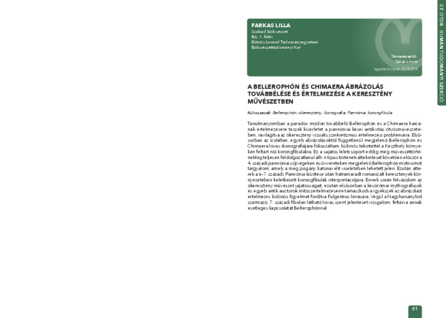Farkas Lilla: A Bellerophón és Chimaera ábrázolás továbbélése és értelmezése a keresztény művészetben : [absztrakt].