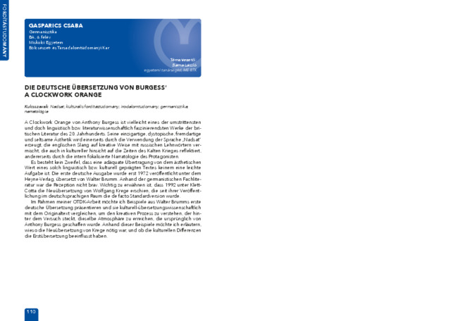 Gasparics Csaba: Die deutsche Übersetzung von Burgess' A clockwork orange : [abstract].