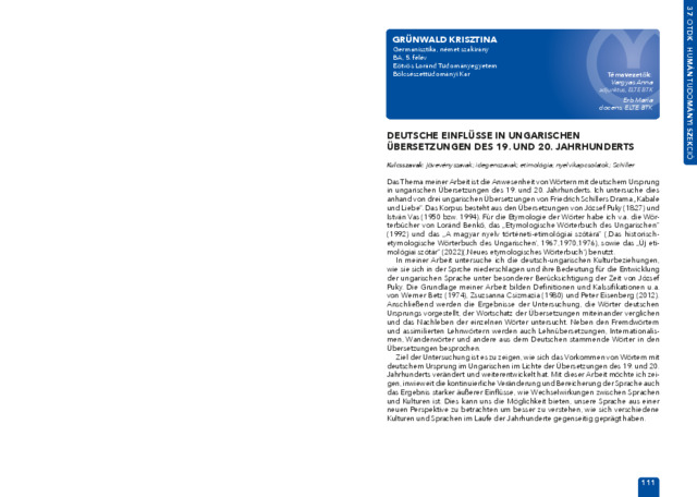 Grünwald Krisztina: Deutsche Einflüsse in ungarischen Übersetzungen des 19. und 20. Jahrhunderts : [abstract].