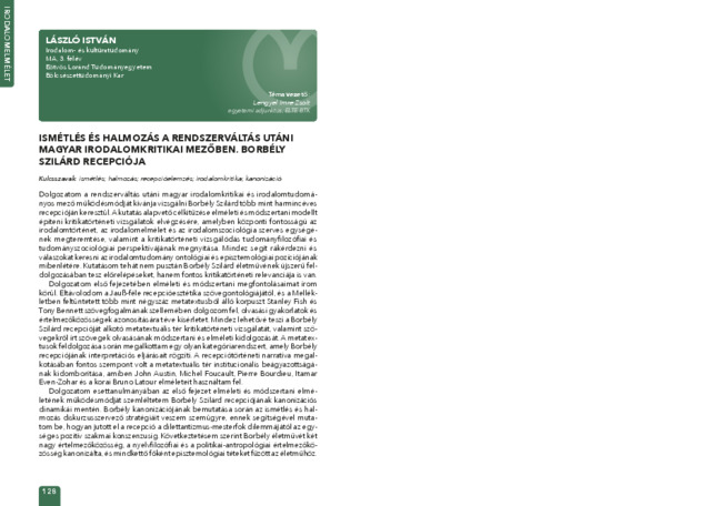 László István: Ismétlés és halmozás a rendszerváltás utáni magyar irodalomkritikai mezőben : Borbély Szilárd recepciója : [absztrakt].