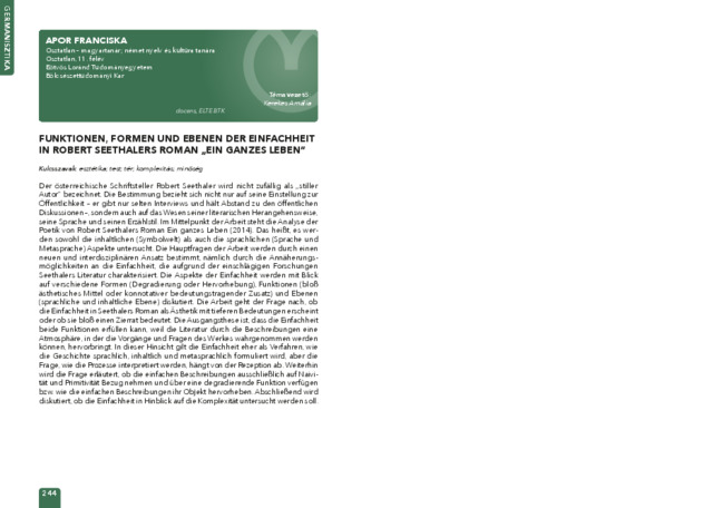 Apor Franciska: Funktionen, Formen und Ebenen der Einfachheit in Robert Seethalers Roman "Ein ganzes Leben" : [abstract].