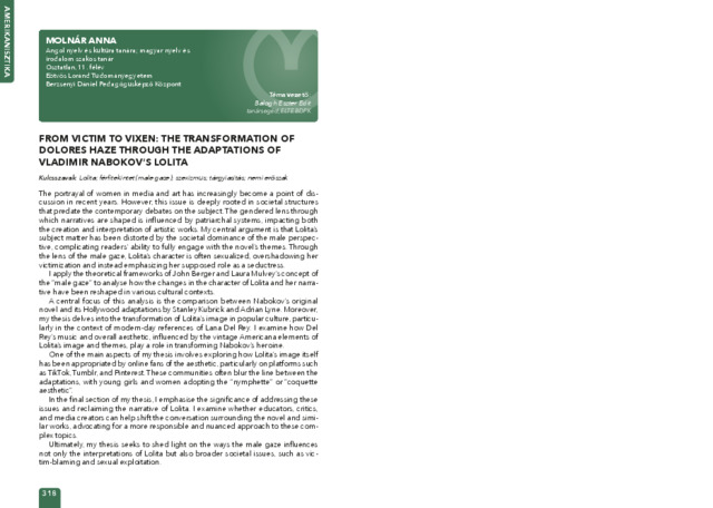 Molnár Anna: From victim to vixen: the transformation of Dolores Haze through the adaptations of Vladimir Nabokov's Lolita : [abstract].