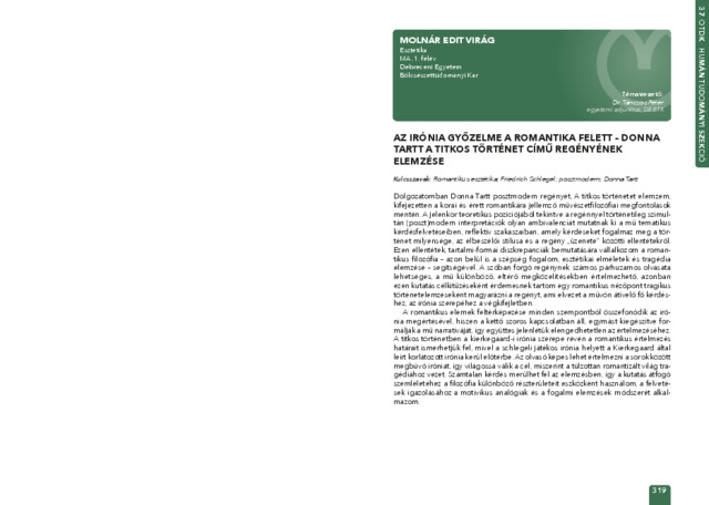 Molnár Edit Virág: Az irónia győzelme a romantika felett - Donna Tartt A titkos történet című regényének elemzése : [absztrakt].