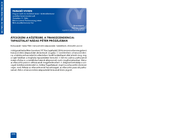 Faragó Vivien: Átcsúszni a köztesbe : a transzcendenciatapasztalat Nádas Péter prózájában : [absztrakt].