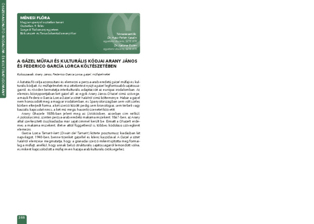 Ménesi Flóra: A gázel műfaji és kulturális kódjai Arany János és Federico García Lorca költészetében : [absztrakt].