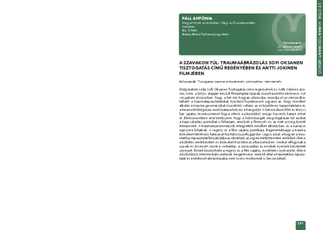 Páll Antónia: A szavakon túl: traumaábrázolás Sofi Oksanen Tisztogatás című regényében és Antti Jokinen filmjében : [absztrakt].