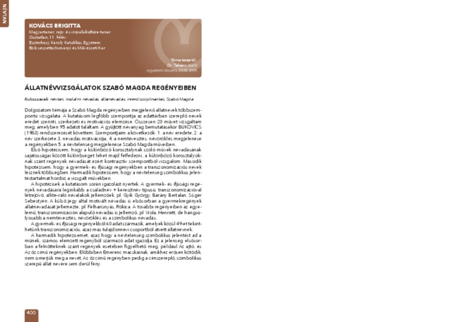 Kovács Brigitta: Állatnévvizsgálatok Szabó Magda regényeiben : [absztrakt].
