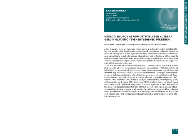 Kaiser Kamilla: Neologizmusok az udmurt nyelvben Kuzebaj Gerd nyelvújító tevékenységének tükrében : [absztrakt].