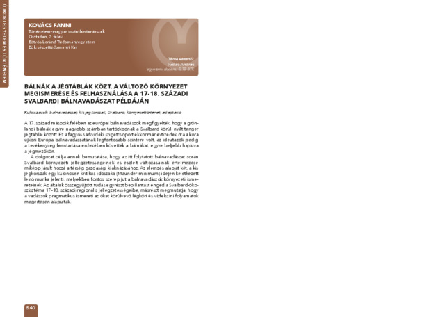 Kovács Fanni: Bálnák a jégtáblák közt : a változó környezet megismerése és felhasználása a 17-18. századi svalbardi bálnavadászat példáján : [absztrakt].