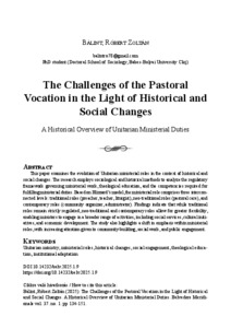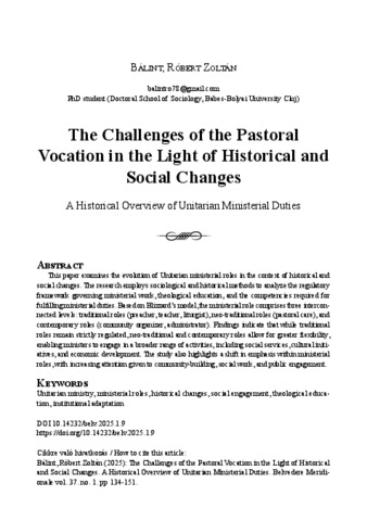 Bálint Róbert Zoltán: The challenges of the pastoral vocation in the light of historical and social changes : a historical overview of unitarian ministerial duties. In: Belvedere Meridionale, (37) 1. pp. 134-151. (2025)
