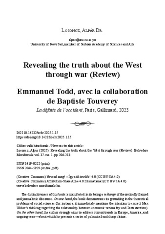 Losoncz Alpár: Revealing the truth about the West through war (Review) : Emmanuel Todd, avec la collaboration de Baptiste Touverey La défaite de l'occident, Paris, Gallimard, 2023. In: Belvedere Meridionale, (37) 1. pp. 206-213. (2025)