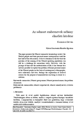 Kozmács István: Az udmurt embernevek néhány elméleti kérdése. In: Értelem és érzelem : írások Sipocz Katalin tiszteletére, (57). pp. 131-146. (2024)