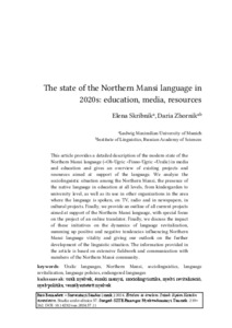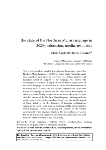 Skribnik Elena; Zhornik Daria: The state of the Northern Mansi language in 2020s: education, media, resources. In: Értelem és érzelem : írások Sipocz Katalin tiszteletére, (57). pp. 239-262. (2024)