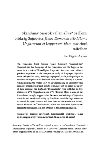Aspaas Per Pippin: Skandináv óriások vállán állva? : szellemi örökség Sajnovics János Demonstratio Idioma Ungarorum et Lapponum idem esse című művében. In: „a te Columbusod, Vespuccid” : tanulmányok Sajnovics Jánosról és a 250 éves Demonstratióról, (Suppl.). pp. 11-33. (2023)