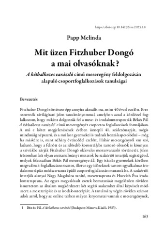 Papp Melinda: Mit üzen Fitzhuber Dongó a mai olvasóknak? : A kétbalkezes varázsló című meseregény feldolgozásán alapuló csoportfoglalkozások tanulságai. In: "Csak úgy egyszerűen: zummbele!" : tanulmányok Békés Pál A kétbalkezes varázsló című meseregényéről. pp. 163-184. (2025)